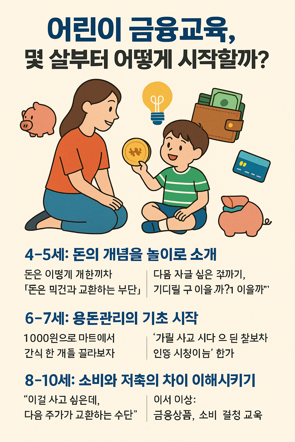 어린이 금융교육, 몇 살부터 어떻게 시작할까?서론: 왜 어린이 금융교육이 중요한가?“돈은 어른들만의 이야기다.” 과연 그럴까요?최근 몇 년 사이 부모들 사이에서 어린이 금융교육에 대한 관심이 빠르게 증가하고 있습니다.용돈관리, 저축습관, 소비습관은 아이가 자라면서 반드시 익혀야 할 중요한 삶의 기술입니다.특히 디지털 시대를 살아가는 요즘 아이들은 용돈도 카드로 받고, 간편결제에 익숙해지면서 돈의 개념을 제대로 이해하지 못한 채 소비를 시작하는 경우가 많습니다.따라서 금융교육은 어릴수록 자연스럽게 시작하는 것이 가장 좋다는 의견이 많습니다.몇 살부터 시작하면 좋을까?많은 부모들이 궁금해합니다.“금융교육은 도대체 언제부터 시작하는 게 좋을까요?”전문가들은 만 4~5세부터 자연스럽게 시작하는 것이 가장 효과적..